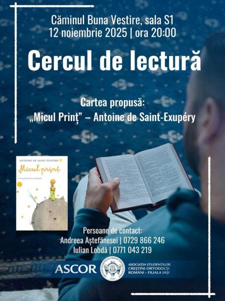 Asociația Studenților Creștini Ortodocși Români – Filiala Iași organizează un cerc de lectură dedicat volumului „Micul Prinț” de Antoine de Saint-Exupéry, desfășurat în Sala S1 din incinta Căminului „Buna Vestire”, în intervalul 20.00-21.30, la care sunt invitați să participe voluntarii și studenții dornici de reflecție și dialog pe marginea acestei opere clasice.