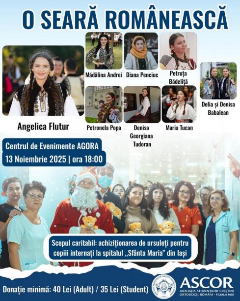 Asociația Studenților Creștini Ortodocși Români – Filiala Iași organizează evenimentul „O seară românească”, desfășurat la Centrul de Evenimente AGORA, în intervalul 18.00-22.00. Evenimentul este destinat publicului larg și îi are ca invitați pe: Angelica Flutur, Diana Penciuc, Mădălina Andrei, Petronela Popa, Denisa Georgiana Tudoran, Maria Tucan, Petruța Bădeliță, Delia și Denisa Babalean. În cadrul spectacolului caritabil va fi lansată campania „Moș Crăciun la copiii din spitale”, prin intermediul căreia, în preajma Crăciunului, fiecare copil internat la Spitalul „Sfânta Maria” din Iași va primi un dar. Intrarea se va face pe bază de donații: studenți – 35 lei; adulți – 40 lei.